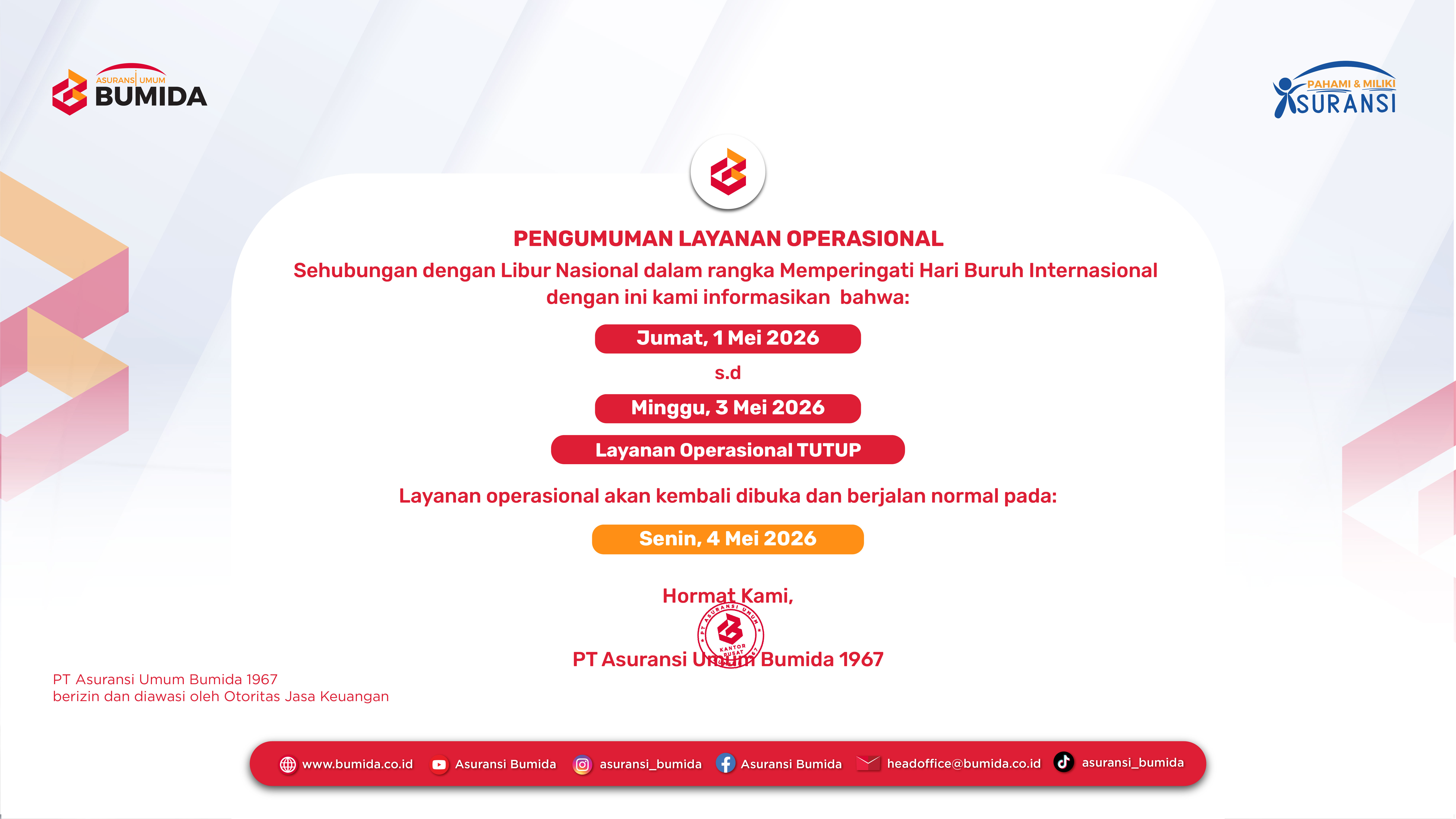 Depok, 24 April 2026 – Bumida Cabang Depok Serahkan Klaim Mahasiswakoe kepada Keluarga Mahasiswa Sekolah Tinggi Pariwisata Bogor