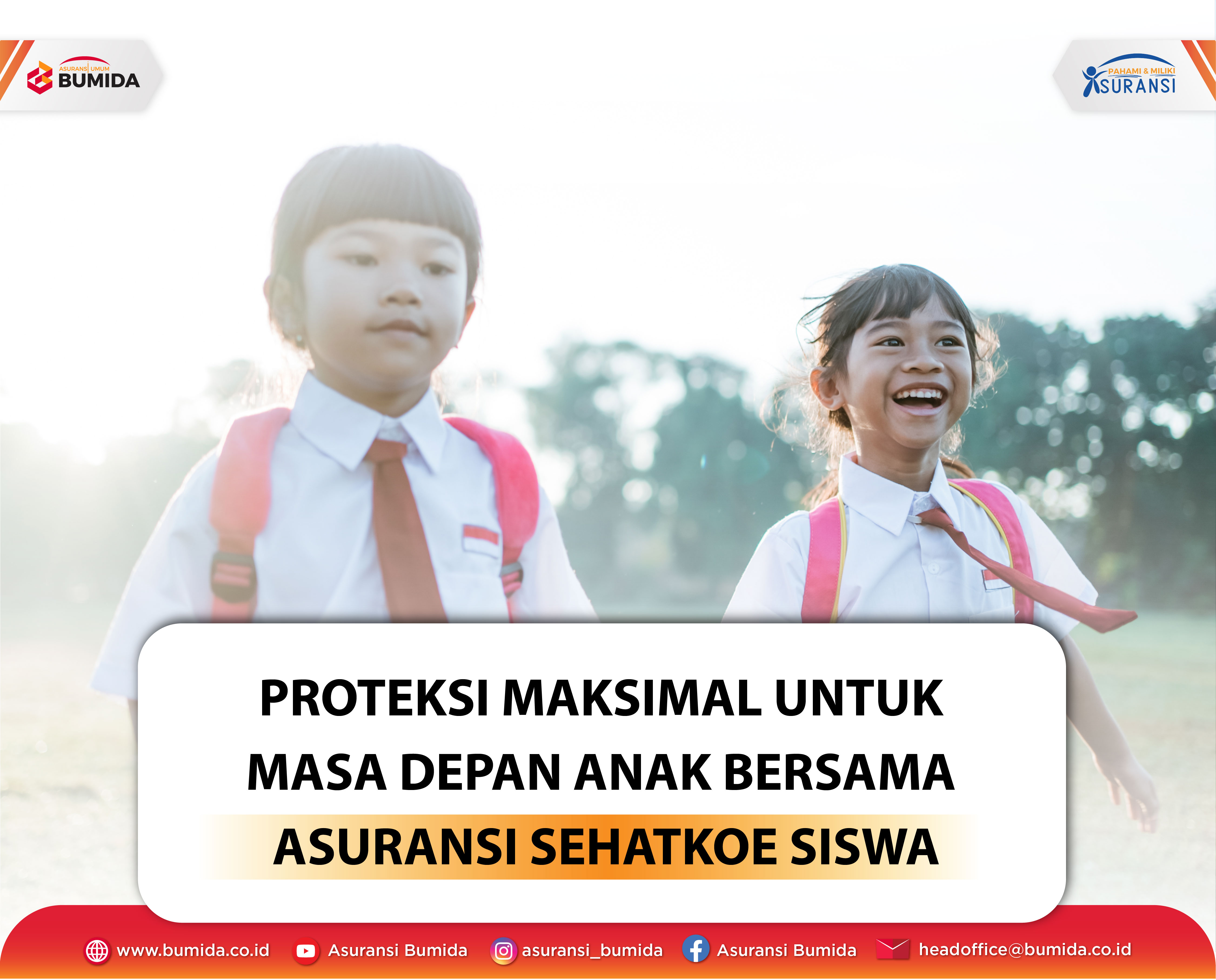 Kesehatan anak adalah investasi paling berharga bagi setiap orang tua, karena risiko sakit atau kecelakaan bisa datang tanpa pernah memberi tanda. Di tengah aktivitas sekolah dan tumbuh kembang yang semakin aktif, orang tua membutuhkan perlindungan yang tidak hanya menenangkan hati, tetapi juga meringankan beban finansial saat hal tak terduga terjadi. Asuransi Sehatkoe Siswa hadir sebagai solusi perlindungan kesehatan khusus anak usia sekolah dengan manfaat luas dan fleksibel, sehingga putra-putri dapat memperoleh perawatan terbaik tanpa rasa khawatir. Melalui perlindungan ini, PT Asuransi Umum Bumida 1967 berkomitmen mendampingi orang tua dalam menjaga masa depan anak tetap sehat, aman, dan penuh harapan.